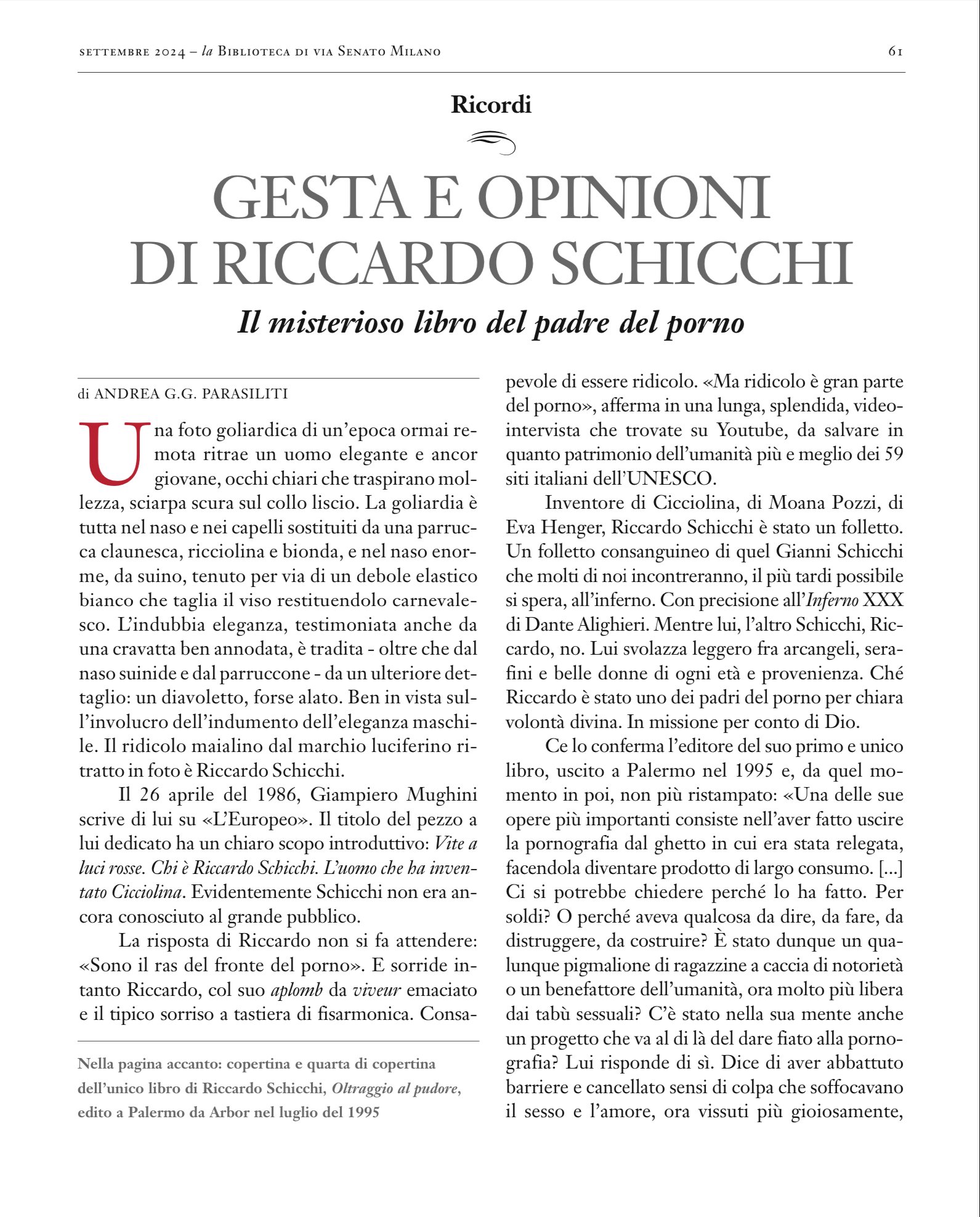 “Gesta e opinioni di Riccardo Schicchi, gentiluomo” in Biblioteca di via Senato, settembre 2024