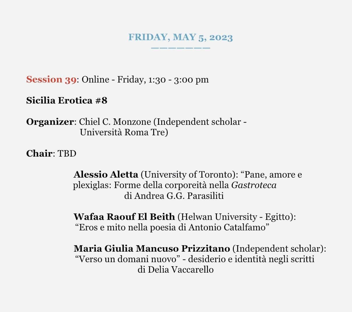 Ebbene sì, all’interno di una sessione dal titolo “Sicilia Erotica” organizzata da Chiel C. Monzone dell’Università Roma Tre, Alessio Aletta (University of Toronto) parlerà di