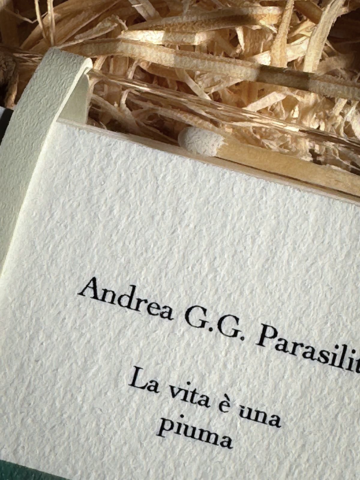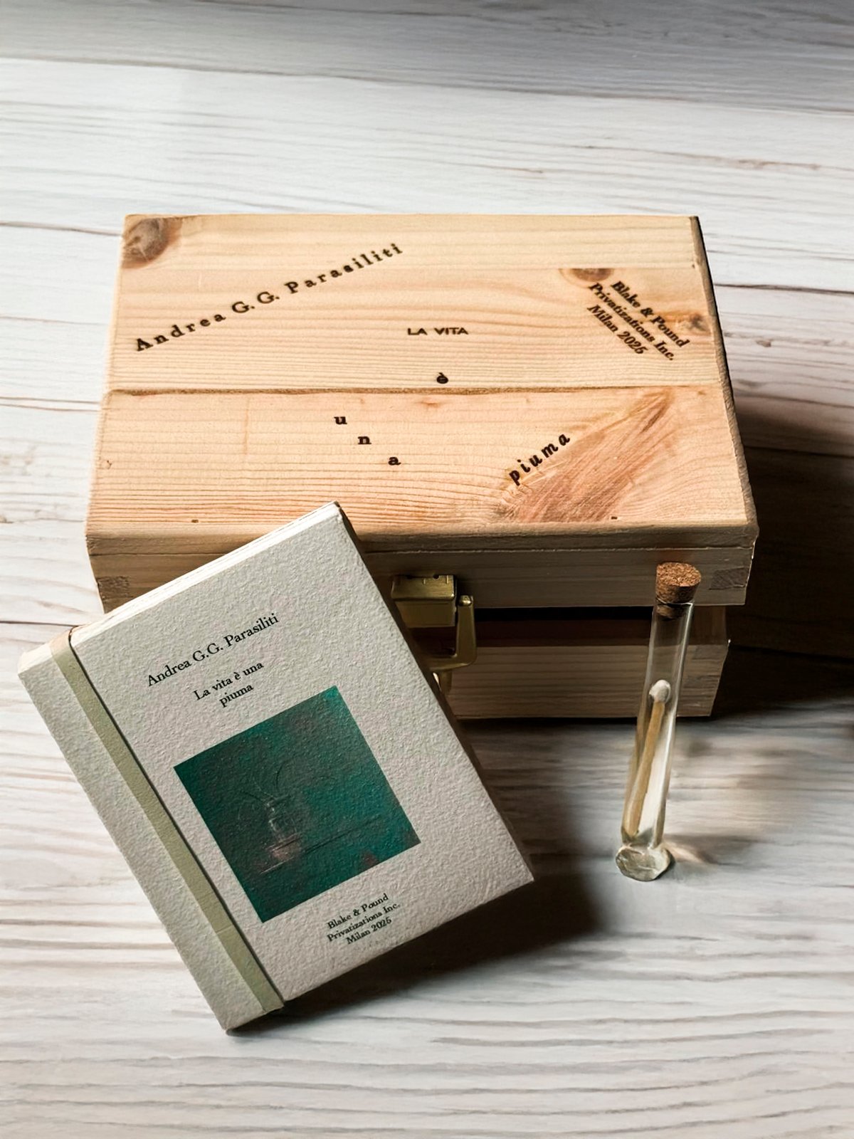 “La vita è una piuma” poggia su trucioli di legno ed è custodito in una scatola di pino massello, realizzata su misura e incisa a fuoco da Massimiliano Stefanelli, a Magione, sul Trasimeno.