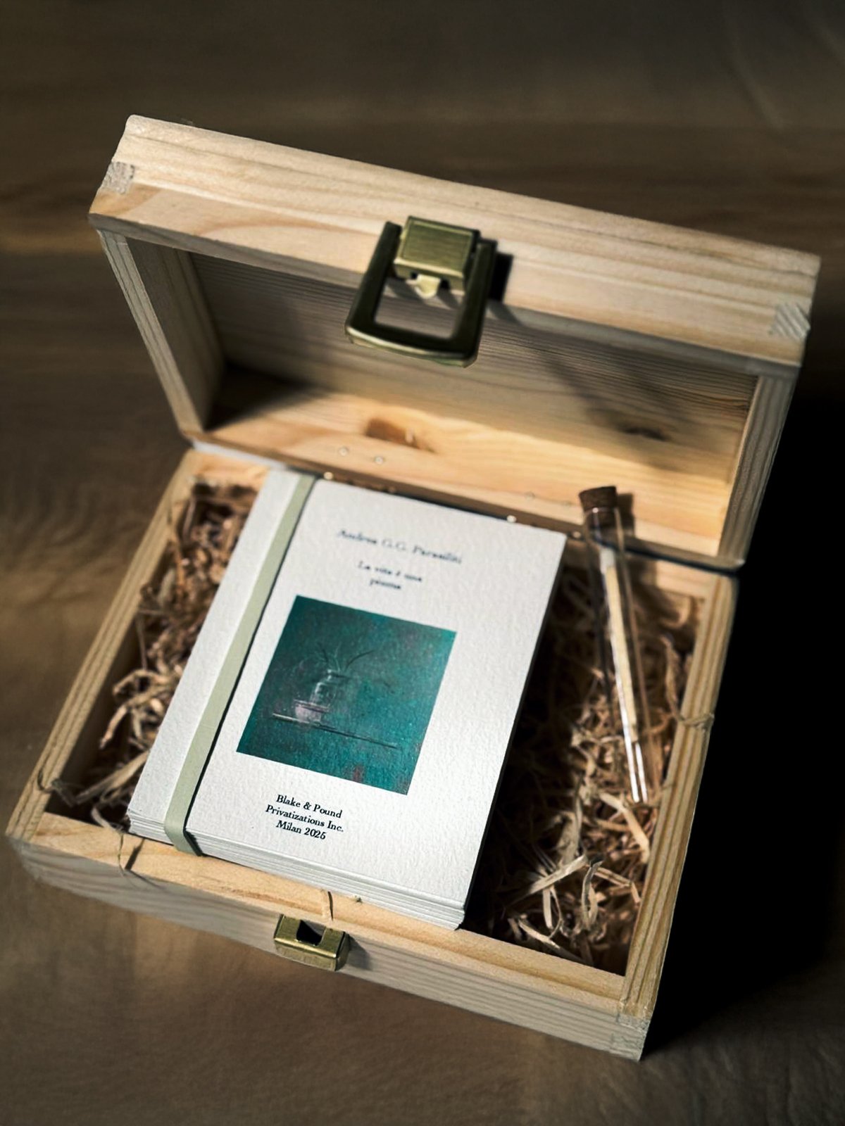 Legno, paglia e carte pregiate che i più futuristi potranno persino incendiare con il fiammifero d’artista contenuto in un’ampolla di vetro, racchiusa nella scatola.