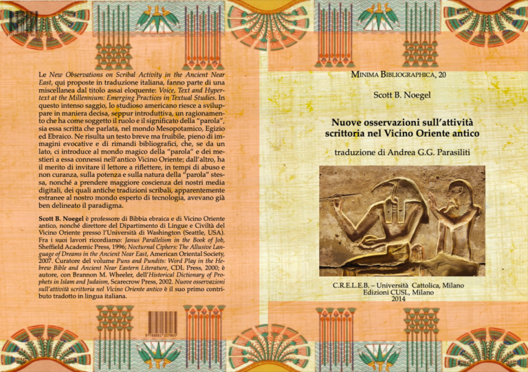 Le New Observations on Scribal Activity in the Ancient Near East, qui proposte in traduzione italiana, fanno parte di una miscellanea dal titolo assai eloquente: Voice, Text and Hypertext at the Millennium: Emerging Practices in Textual Studies. In questo intenso saggio, lo studioso americano riesce a sviluppare in maniera decisa, seppur introduttiva, un ragionamento che ha come soggetto il ruolo e il significato della “parola”, sia essa scritta che parlata, nel mondo Mesopotamico, Egizio ed Ebraico. Ne risulta un testo breve ma fruibile, pieno di immagini evocative e di rimandi bibliografici, che, se da un lato, ci introduce al mondo magico della “parola” e dei mestieri a essa connessi nell’antico Vicino Oriente; dall’altro, ha il merito di invitare il lettore a riflettere, in tempi di abuso e non curanza, sulla potenza e sulla natura della “parola” stessa, nonché a prendere maggiore coscienza dei nostri media digitali, dei quali antiche tradizioni scribali, apparentemente estranee al nostro mondo esperto di tecnologia, avevano già ben delineato il paradigma.